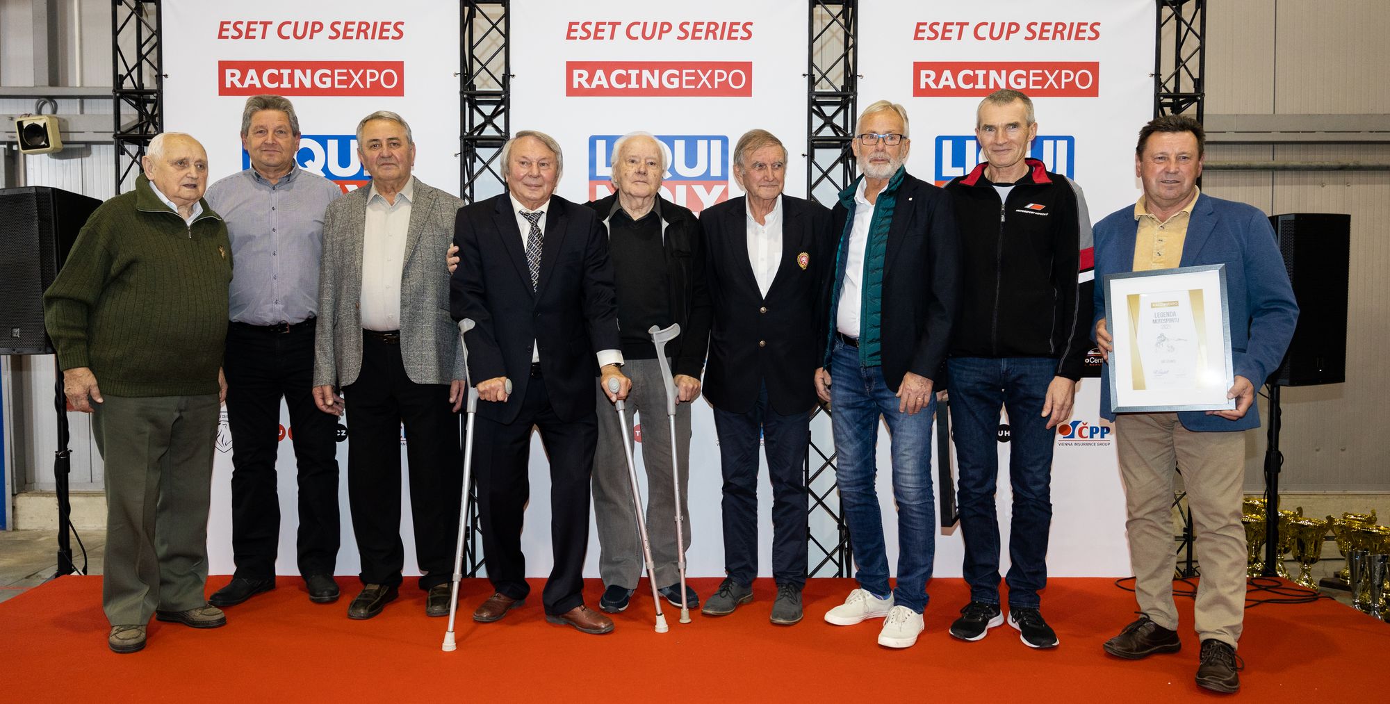 Držitelé ocenění (zleva) Miloslav Souček, Stanislav Zloch, Milan Šimák, Evžen Erban, Václav Bervid, Stanislav Minářík, Karel Havel, Josef Kopecký a Jiří Štancl. Foto racingexpo.cz