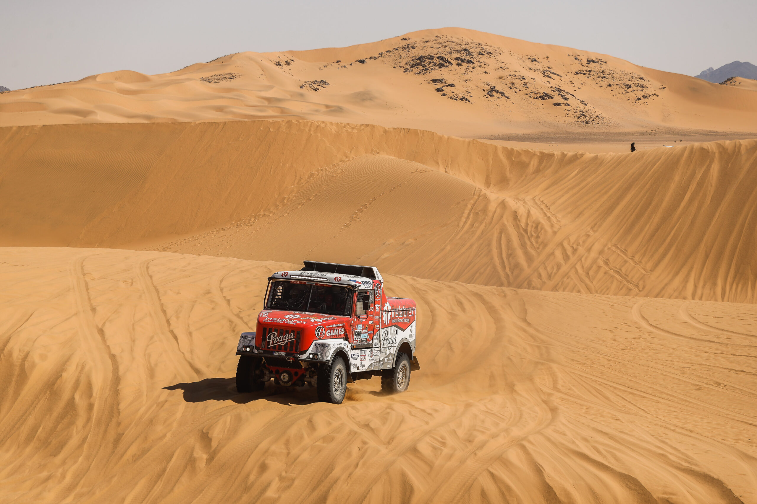 Díky maximálnímu nasazení celého týmu mohla Praga se startovním číslem 508 vyrazit ve čtvrtek 13. ledna do předposlední etapy, o které se už před startem mluvilo jako o nejnáročnější a jedné z nejhezčích z celého letošního ročníku. A sliby organizátorů se vyplnily do puntíku. Na trati speciálky (346 km) se posádky musely vypořádat s náročnými pasážemi velbloudí trávy, zapeklitou navigací, řečišti, kamenitými úseky, ale i obtížnými vysokými a měkkými dunami.