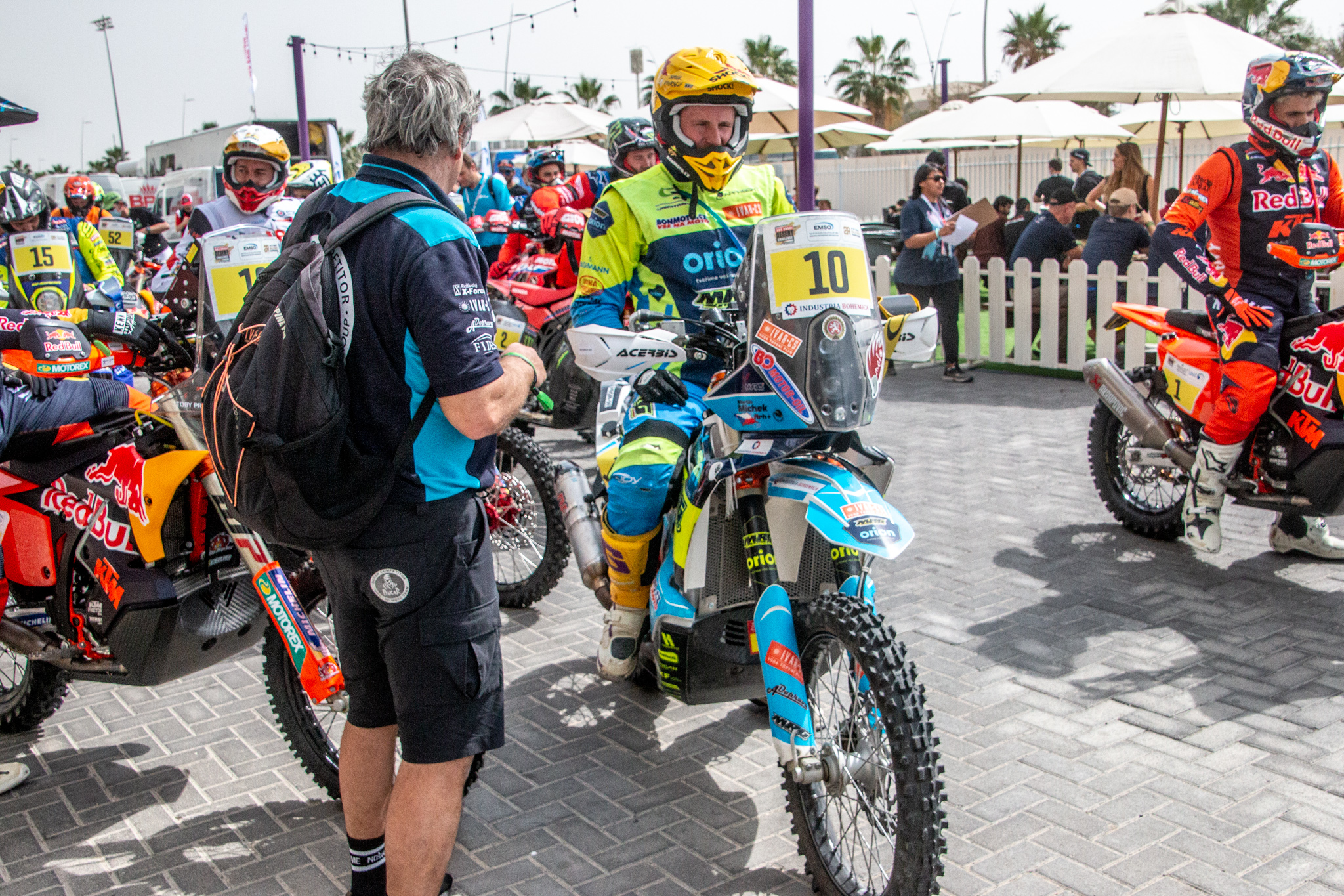 Etapa dlouhá 262 kilometrů byla pouze v písčitých dunách a teplotách kolem 35 stupňů. “Profil etapy byl velmi náročný. Řekl bych, že mnohem víc než jakákoli etapa, kterou jsem jel na Dakaru. Do toho vedra, která budou po celou dobu závodu. Možná ještě větší. Přestože nás čeká 5 závodních dní, bude to velice náročná rallye,” doplnil Michek. Závodníky během Abu Dhabi Desert Challenge bude čekat necelých 2000 kilometrů v poušti, kde se původně měla nedaleko jet i slavná Dakar rallye. “Jsme rádi, že tu díky našim partnerům můžeme být, protože půjde o velice hodnotnou část přípravy. Těšili jsme se, že tudy původně povede Dakar, ale to organizátoři nakonec změnili. Podmínky tu jsou opravdu náročné, všude jen samé duny. Od malé, velké, zlomené a nebezpečné. Do toho vše zkresluje světlo. Dnes třeba už na pátém kilometru vypadl velezkušený Al-Attiyah,” popsal dění v Abu Dhabi manager Orion – Moto Racing Group, Ervín Krajčovič.