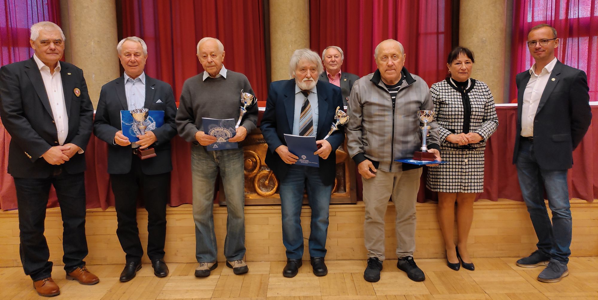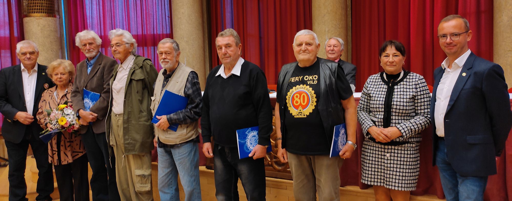 Jubilanti, slavící letos 80., 85. a 90. narozeniny, převzali blahopřání a poděkování z rukou Jana Šťovíčka, Františka Čečila, Evžena Erbana a místopředsedkyně Klubu závodníků veteránů Evy Buriánkové.