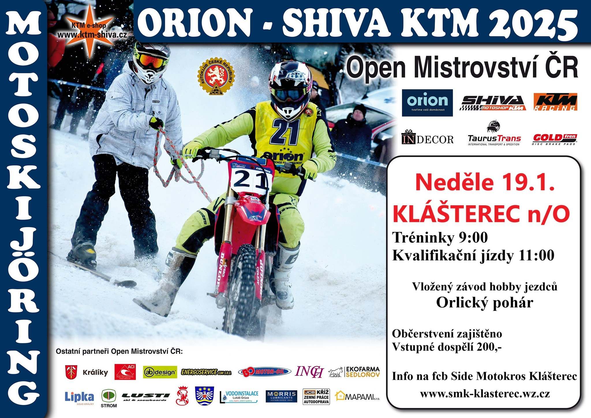 AKTUALIZACE STŘEDA 15. 1. 2025 20:42: Nedělní závod OPEN Mistrovství ČR „ORION-SHIVA KTM“ 2025 se pojede. V Klášterci nad Orlicí celý týden připravovali trať tak, aby byli jezdci i diváci maximálně spokojeni. Pojede se na známé trati uprostřed obce. Podobně jako v Dobřanech by se závodu měli zúčastnit i kvalitní jezdci z Lotyšska. Diváci se mají na co těšit!