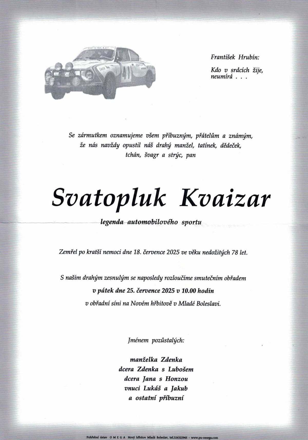 Poslední rozloučení s panem Kvaizarem se koná v pátek 25. července 2025 v 10.00 hodin v obřadní síni na Novém hřbitově v Mladé Boleslavi.