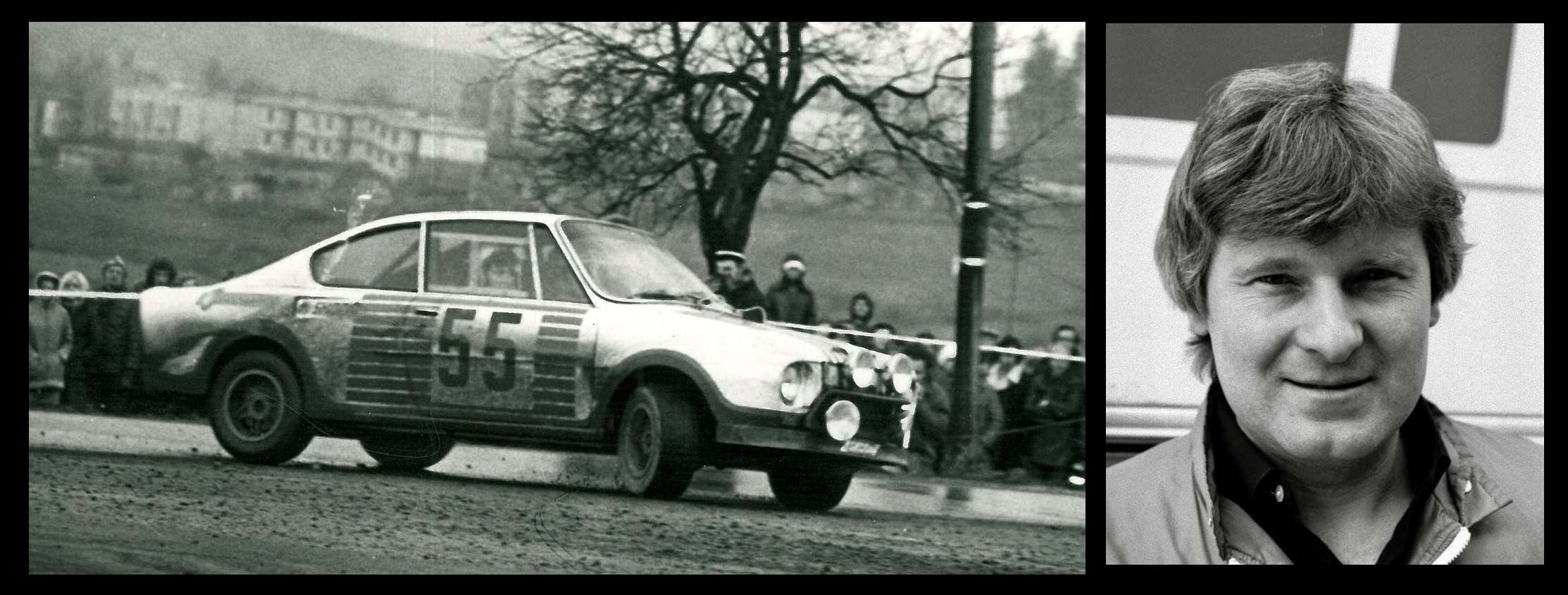 Rallye Šumava, archivní snímek z roku 1977, Svatopluk Kvaizar za volantem tovární Škody 130RS ve „špici,“ na nejznámějším místě rychlostní zkoušky u Čínova.
