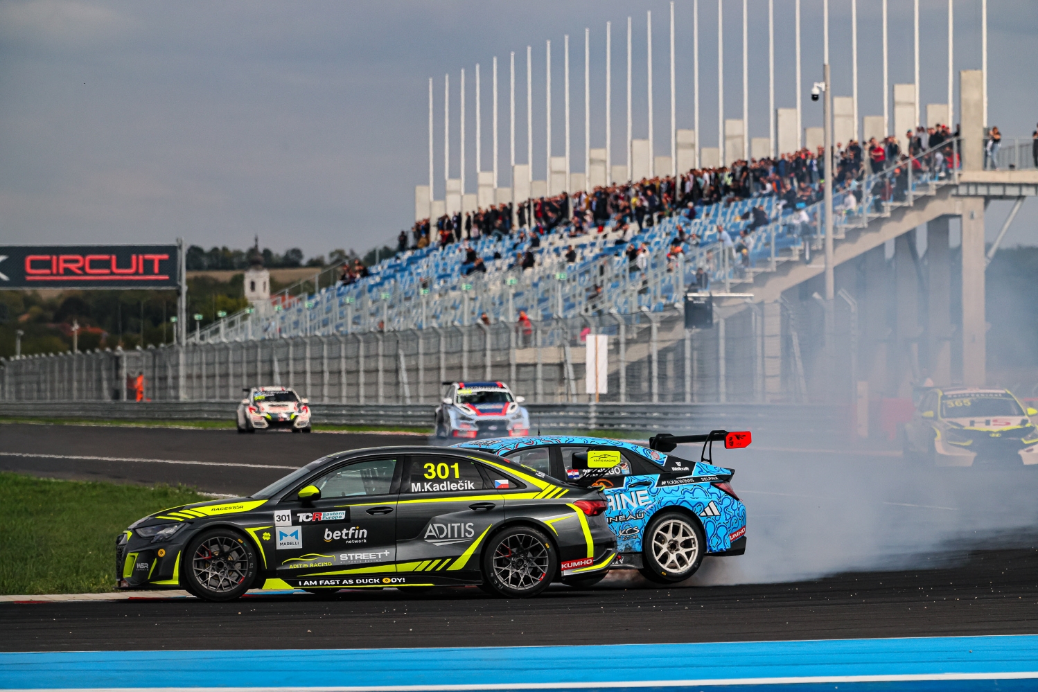 První závod víkendu začal zostra. Kadlečík věděl, že si nesmí nechat Kouta ujet. Věděl, že musí okamžitě zaútočit, jinak mu světlemodrý Hyundai Elantra unikne. Hned po startu se proto pokusil dostat dopředu a v první zatáčce mezi nimi došlo ke kontaktu. Byl to ale klasický bodyček, na který jsme v závodech cestovních vozů zvyklí a oba pokračovali dál.