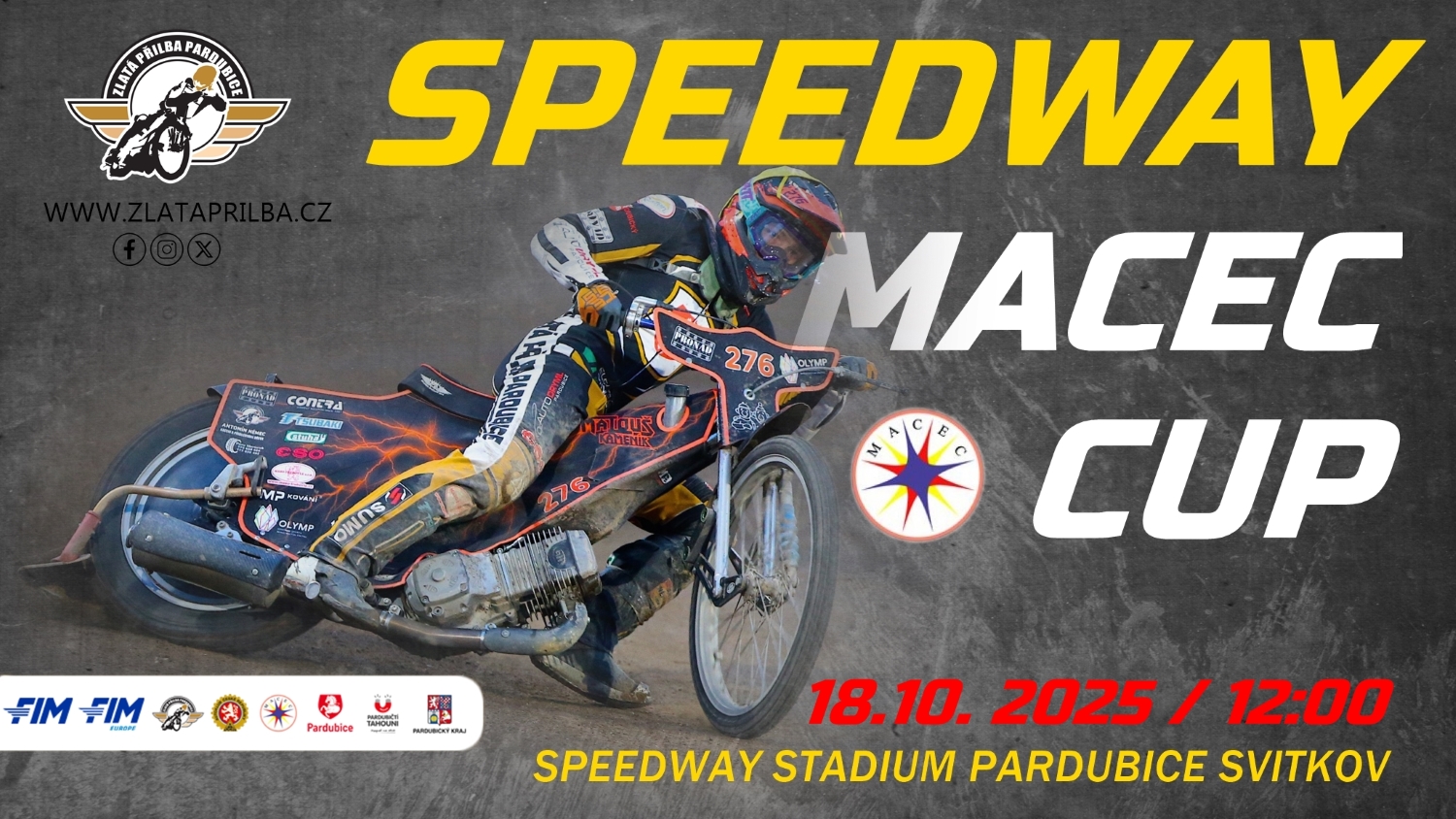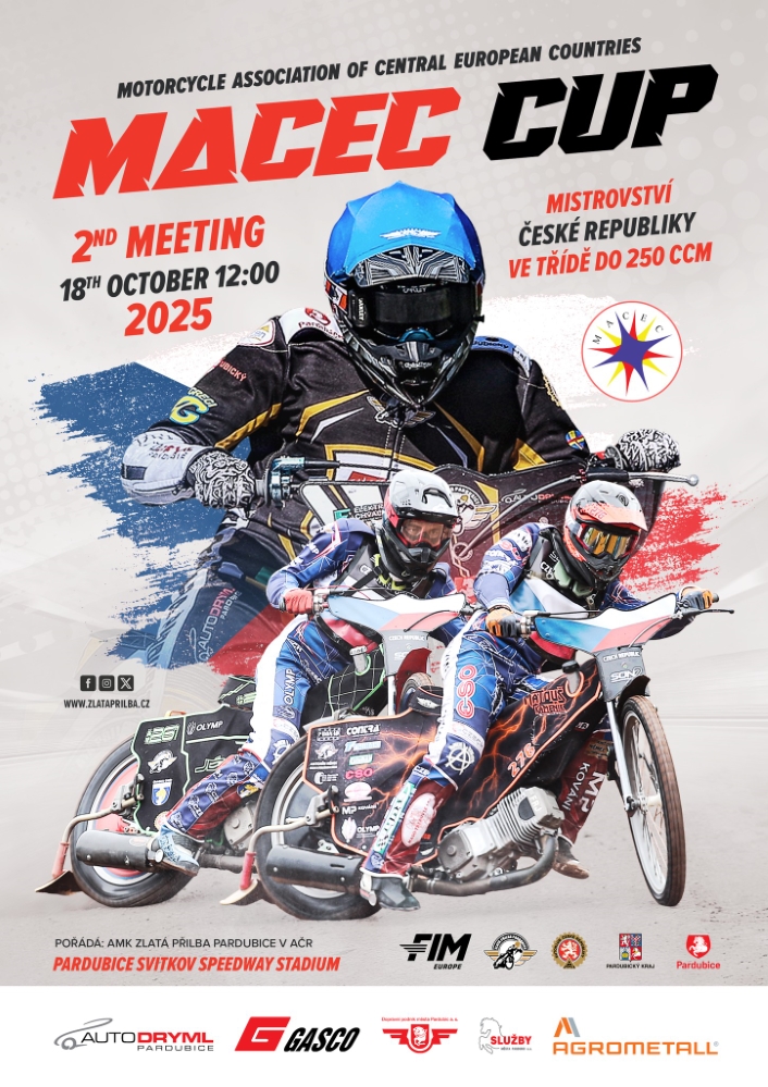 V sobotu 18. 10. 2025 se rozloučí s letošní závodní sezónou pardubický ovál na Svítkově. Posledním dvanáctým podnikem bude závod zemí střední Evropy MACEC cup a s ním spojený souboj mladíků v MČR ve třídě do 250 ccm. Přijďte si užít posledních 30 jízd letošního roku na Svítkově a podpořit naše mladé jezdce vedené velezkušeným Jardou Petrákem v konkurenci s Poláky, Ukrajinci, Rumuny a Bulhary. Souboj o nového mistra republiky v kategorii do 250 ccm přivede na start také mezinárodní obsazení ze Slovinska, Dánska, Slovenska a Ukrajiny.