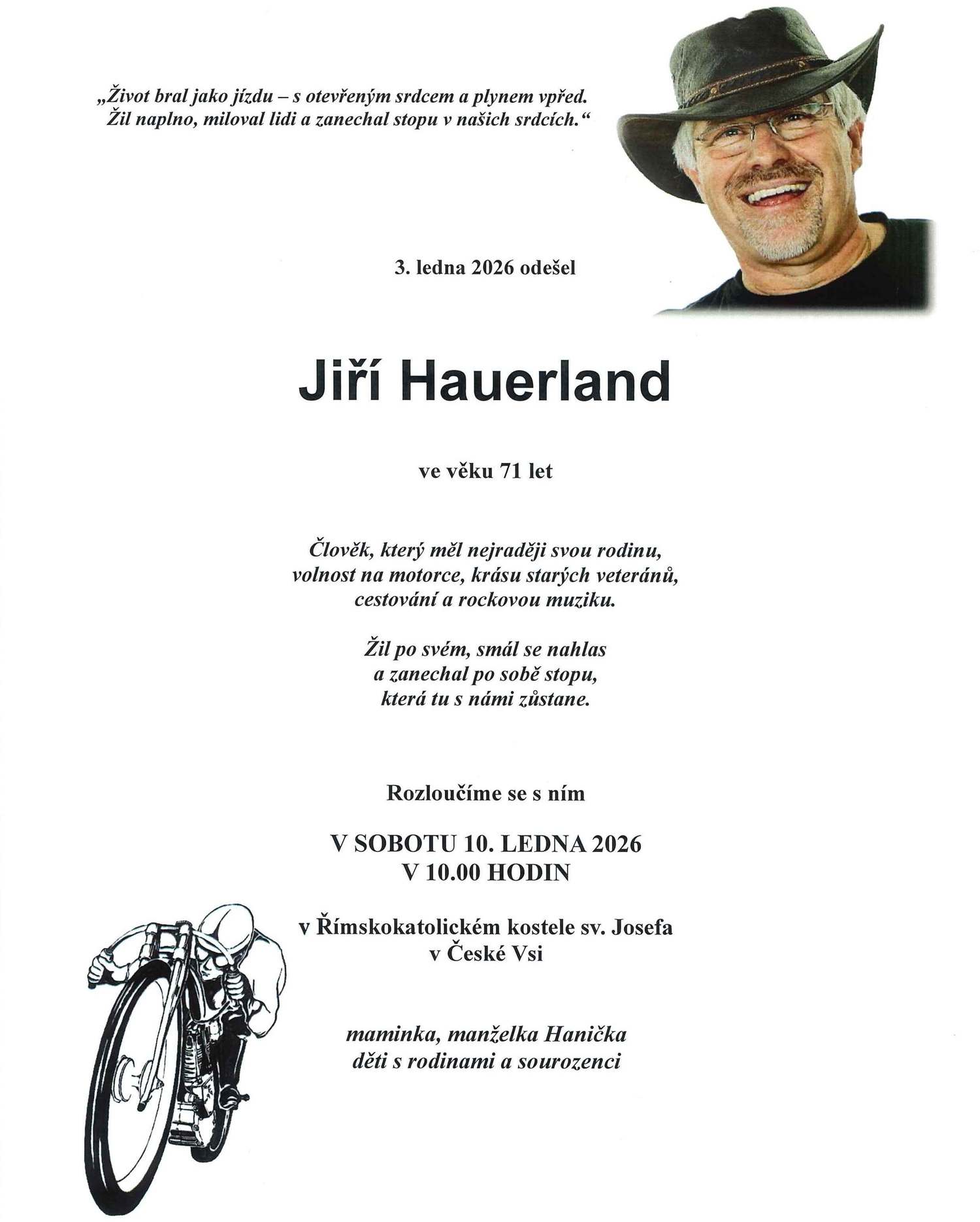 Poslední rozloučení se uskuteční v sobotu 10. ledna 2026 v 10.00 hodin v Římskokatolickém kostele sv. Josefa v České Vsi.