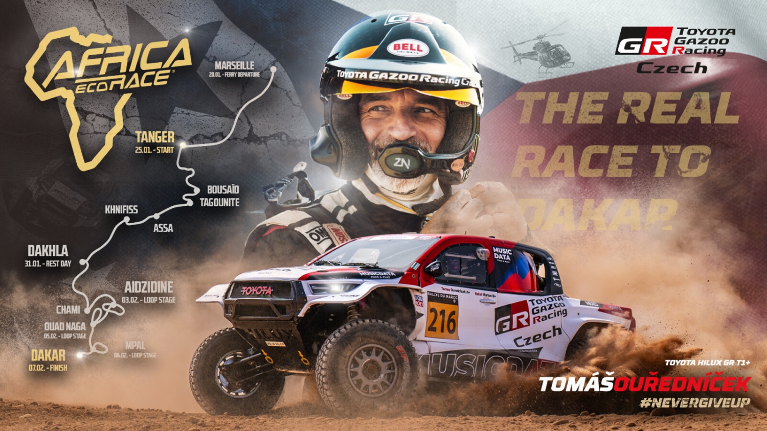 Na trať se vydá se speciálem Toyota Hilux GR V8 kategorie T1+, opět s navigátorem Lukášem Bartákem. Pod kapotou bude pracovat nový pětilitrový atmosférický osmiválec, jehož výkon těží i z aktuálních úprav technických předpisů FIA. Tým posílí také inženýr, který bude mít motor po celou dobu závodu pod detailním dohledem.
